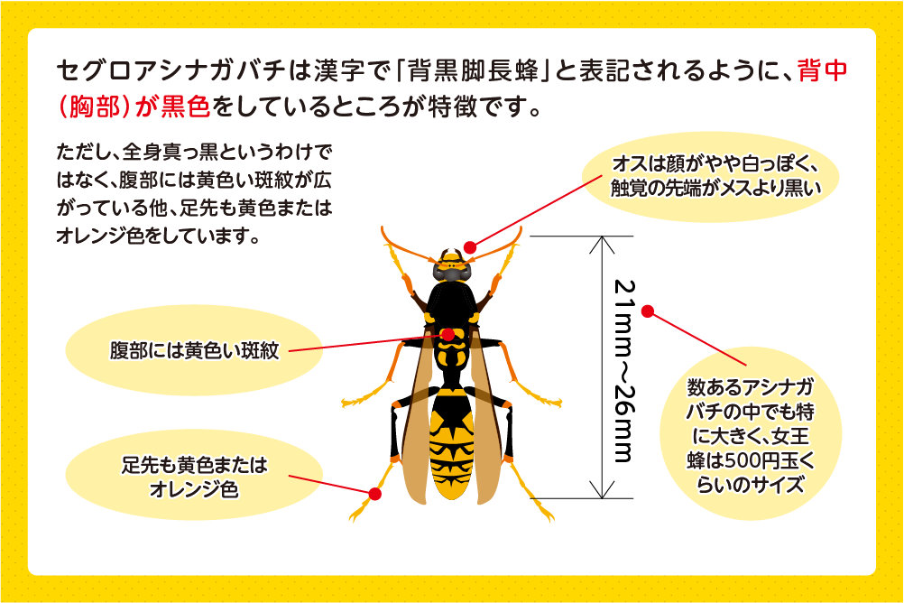 体長は21~26ミリメートルと、数あるアシナガバチの中でも特に大きく、女王蜂は500円玉くらいのサイズです。体が大きいため、飛んでいるときは大きな羽音を立てます。その上、スズメバチと見た目が似ており、見間違うケースも少なくありません。実際にはセグロアシナガバチの方がスズメバチよりも体のサイズが大きいため、遭遇したときはその存在感に驚かされる方も多いでしょう。