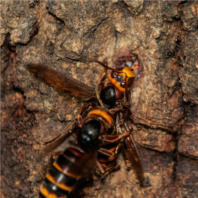 モンスズメバチは、体長が最大35mmに達する大型のスズメバチで、強い毒と攻撃性を持ちます。巣は木の間や建物の隙間に作られ、他の昆虫を捕食して幼虫に与えます。秋には繁殖期に入るため活動が盛んになり、巣への接近が刺傷事故につながることもあります。巣を見つけた場合は、安全のため専門業者に駆除を依頼することが推奨されます。